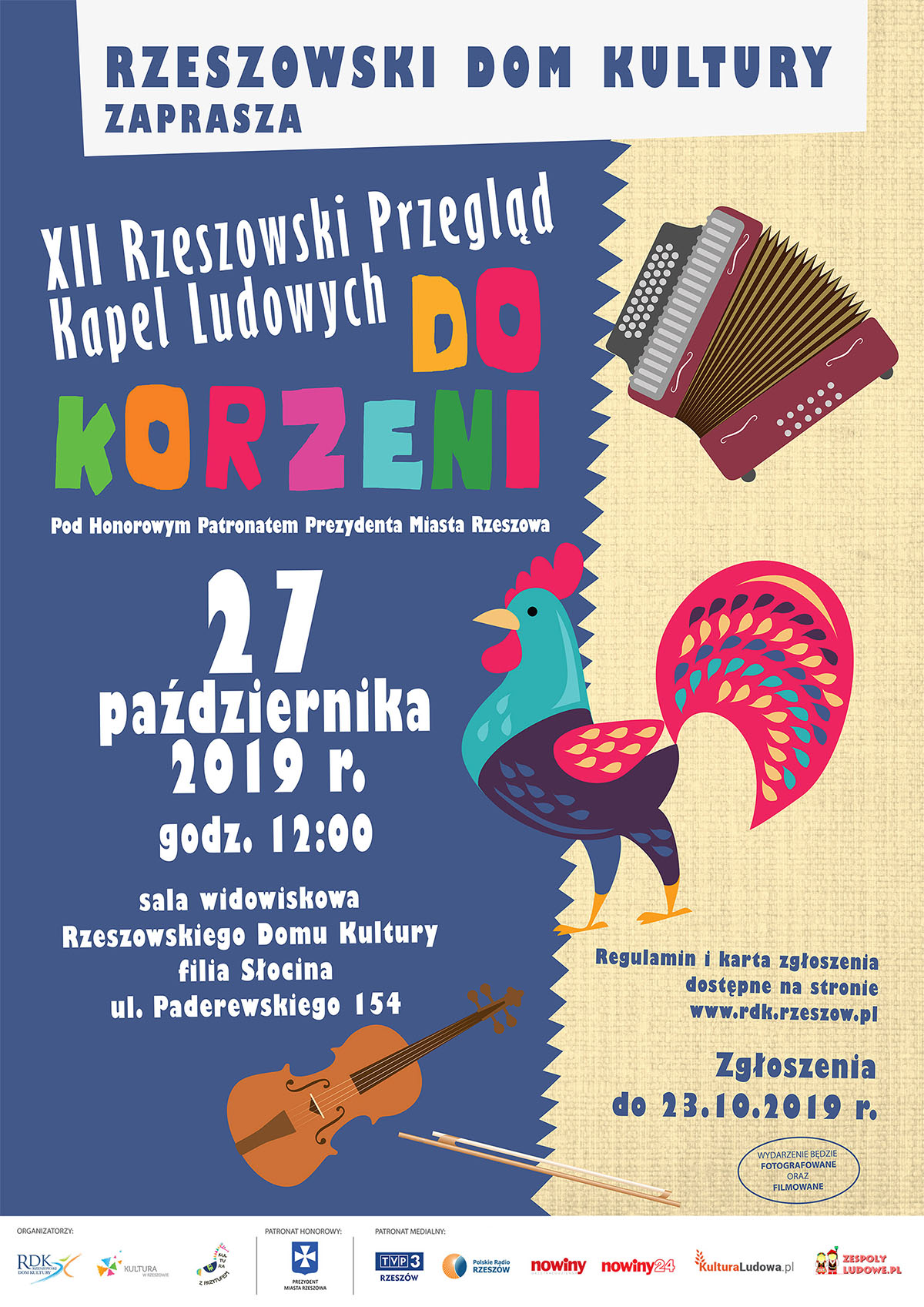 Rzeszowski Dom Kultury zaprasza podkarpackich wykonawców folklorystycznych oraz wszystkich miłośników muzyki ludowej na XII Rzeszowski Przegląd Kapel Ludowych „Do Korzeni” pod Honorowym Patronatem Prezydenta Miasta Rzeszowa. |