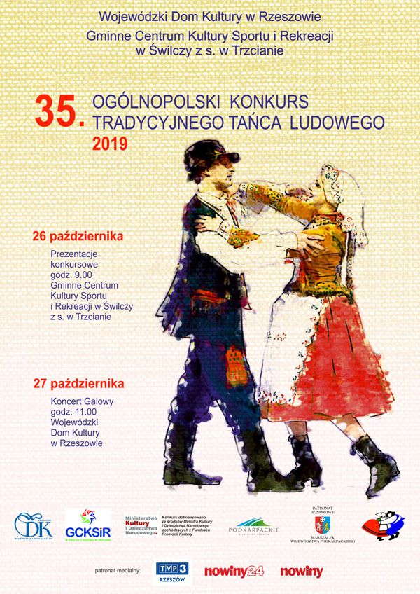 Wojewódzki Dom Kultury w Rzeszowie oraz Gminne Centrum Kultury Sportu i Rekreacji w Świlczy z. s w Trzcianie zapraszają na 35. Ogólnopolski Konkurs Tradycyjnego Tańca Ludowego, który odbędzie się w dniach 26-27 października 2019 r. |