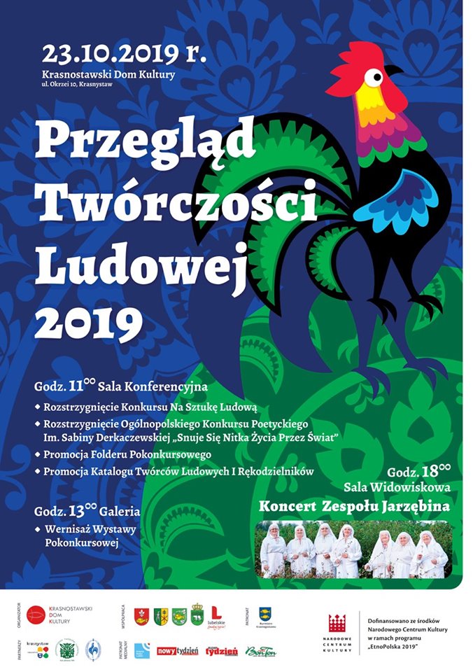 Krasnostawski Dom Kultury zaprasza na finał „Przeglądu Twórczości Ludowej 2019”, który odbędzie się 23 października o godz. 11:00 w Sali Konferencyjnej KDK. |