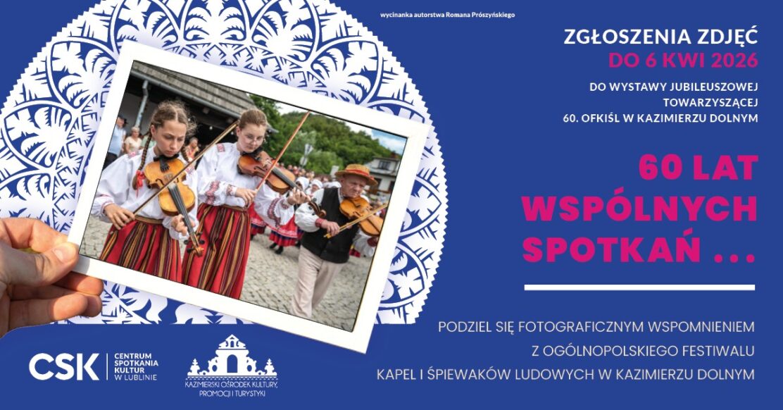 Ogólnopolski Festiwal Kapel i Śpiewaków Ludowych w Kazimierzu Dolnym obchodzi w tym roku swoją 60. edycję. To sześć dekad muzyki, śpiewu, spotkań, wzruszeń i historii zapisanych przede wszystkim w pamięci uczestników, artystów i publiczności. Z tej okazji Centrum Spotkania Kultur w Lublinie (organizator festiwalu) zaprasza do współtworzenia jubileuszowych obchodów i powrotu do festiwalowych wspomnień – zatrzymanych na fotografiach.