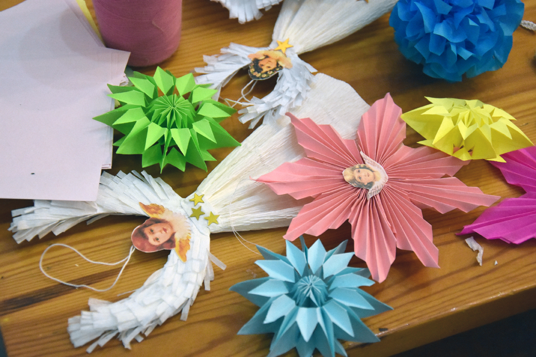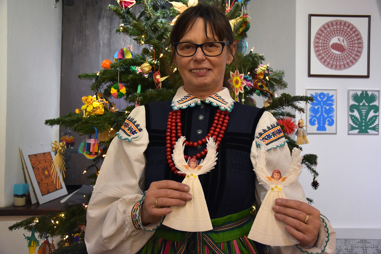 Nasza rodzina zajmuje się twórczością ludową. W chwili obecnej mieszkam w Opocznie, ale moje dzieciństwo spędziłam na wsi w Bielowicach, bo tam się urodziłam. Na Święta Bożego Narodzenia wykonujemy ozdoby na choinkę, m.in. łańcuchy ze słomy, jeżyki jak dawniej robiło się do pająków, gwiazdki, koszyczki i tradycyjne aniołki. Aniołki takie jak babcia robiła, z prostego materiału bibuła i tekturka. Główki aniołków brane były z opłatków, tam widniał taki aniołeczek i wykorzystywano go do tych aniołków. Dawniej to dzieci wykonywały ozdoby, u nas choinkę ubierało się rano w wigilię.