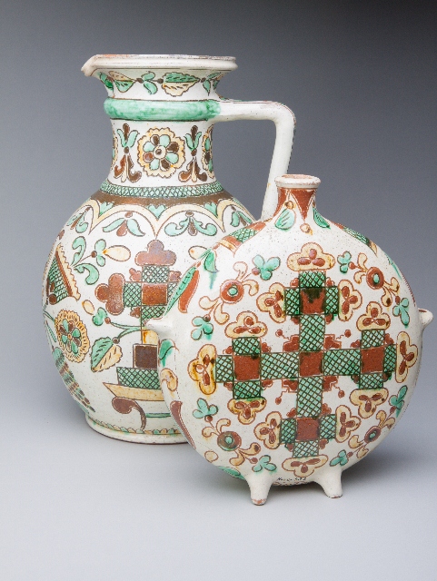 Dopełnieniem aranżacji są współczesne przykłady ceramiki pokuckiej, inspirowanej dawnymi