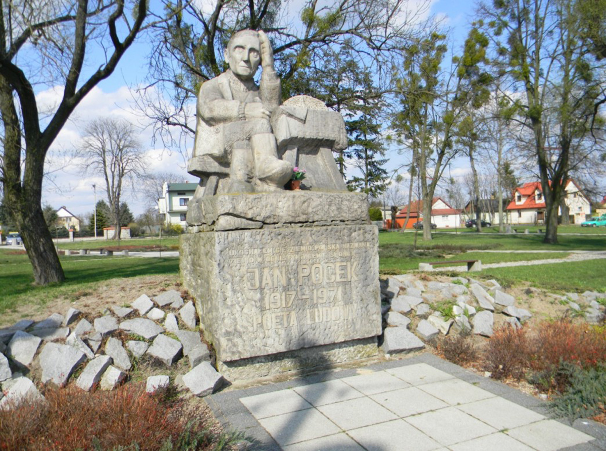 JAN POCEK – poeta ludowy urodzony w 1917 r. w Zabłociu k. Markuszowa, pow. Puławy, zmarł w 1971 r. w Kaleniu. Debiutował w „Wiciach” (1935). W czasie okupacji drukował w prasie konspiracyjnej, działał w Związku Pisarzy Polskich i grupie pisarzy ludowych „Wieś Tworząca”. Po wojnie prowadził gospodarstwo rolne we wsi Kaleń, pracował też jako dziennikarz „Gromady – Rolnika Polskiego”. Członek Stowarzyszenia Dziennikarzy Polskich i Klubu Pisarzy Ludowych, członek – założyciel Stowarzyszenia Twórców Ludowych w 1968 r., odznaczony Złotym Krzyżem Zasługi (1969). Jest przede wszystkim autorem wierszy, drukował w prasie codziennej, pismach literackich i w wielu antologiach. Autorskie edycje jego twórczości: Zgrzebne pieśni (1947), Malwy (1963), Wiersze (1973), Poezje (1980), Głosy Ziemi (1981), Poezje wybrane (1988). W roku 1962 nakręcono film o J. Pocku „W polu”. W 1989 r. Józef Zięba opublikował książkę „Jan Pocek 1917 – 1971”. W 1972 r. po raz pierwszy przyznano Nagrodę Artystyczną im. J. Pocka ustanowioną przez „Chłopską Drogę”. W tym też roku STL zaczął organizować dla swoich członków coroczny Konkurs Literacki im. J. Pocka. W 1983 r. w Markuszowie przy głównej ulicy wystawiono pisarzowi pomnik autorstwa Jarosława Furgały – członka STL.