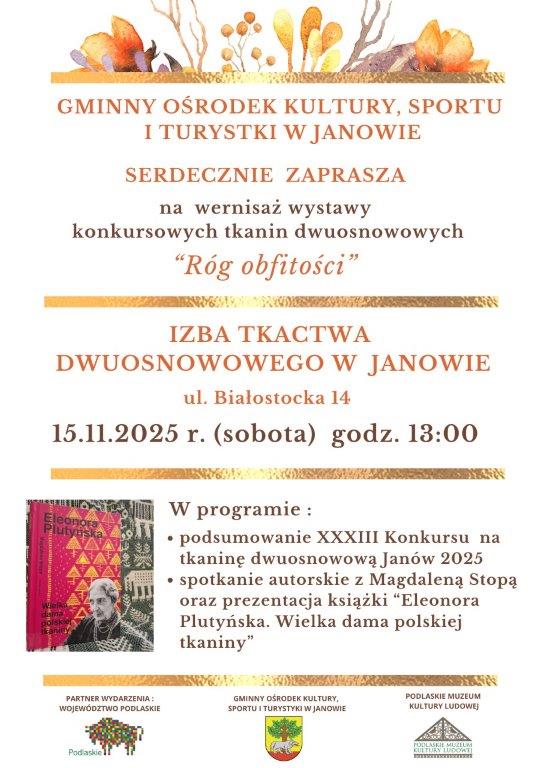 Gminny Ośrodek Kultury, Sportu i Turystyki w Janowie serdecznie zaprasza wszystkich miłośników tradycji, sztuki ludowej i rękodzieła na wyjątkowe wydarzenie — wernisaż wystawy konkursowych tkanin dwuosnowowych „Róg obfitości”, który odbędzie się 15 listopada 2025 r.