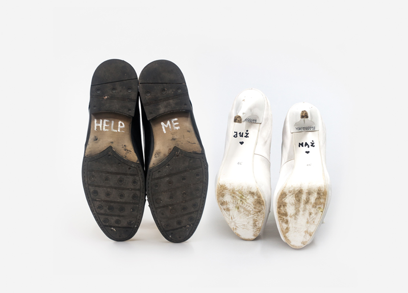 * Foto: Na podeszwach butów narzeczonego przyszła panna młoda napisała: „HELP ME”, na własnych – „JUŻ MĄŻ”. Wesele Eli i Radka, kwiecień 2011. Fot. Marcin Wąsik.