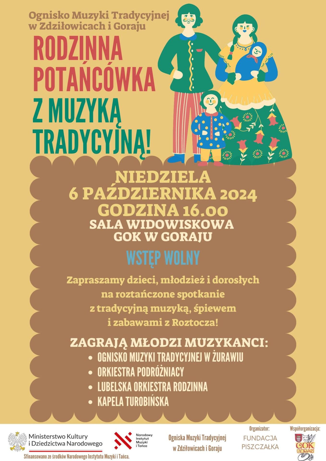Rodzinna potańcówka to wyjątkowe spotkanie kapel oraz inicjatyw skupionych na oddolnej edukacji w zakresie muzyki tradycyjnej regionu Roztocza. Młodzi (ale też i nieco starsi już) muzykanci zagrają do tańca starodawny repertuar i poprowadzą tradycyjne zabawy! Wydarzenie dedykowane jest dla dzieci, młodzieży, rodzin z dziećmi, ale dorośli również będą się na nim świetnie bawić! Jest to niepowtarzalna okazja, żeby zobaczyć w akcji młode pokolenie muzykantów i sprawdzić jak się mają edukacyjne inicjatywy w naszym regionie!