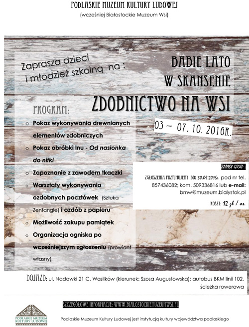 Zainteresowanych prosimy o zgłoszenia pod numerem telefonu: 85 7436 082 lub drogą mailową: pmkl@skansen.bialystok.pl