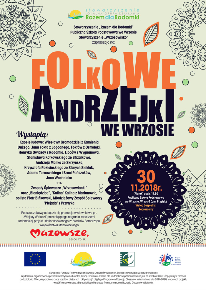 Stowarzyszenie Lokalna Grupa Działania „Razem dla Radomki” serdecznie zaprasza do Wrzosu na Folkowe Andrzejki, współorganizowane wspólnie z Publiczną Szkołą Podstawową we Wrzosie oraz ze Stowarzyszeniem „Wrzosowisko”. Tegoroczne wydarzenie zorganizowane zostanie o godzinie 17.30, w piątek 30 listopada 2018 r. w budynku Publicznej Szkoły Podstawowej we Wrzosie.