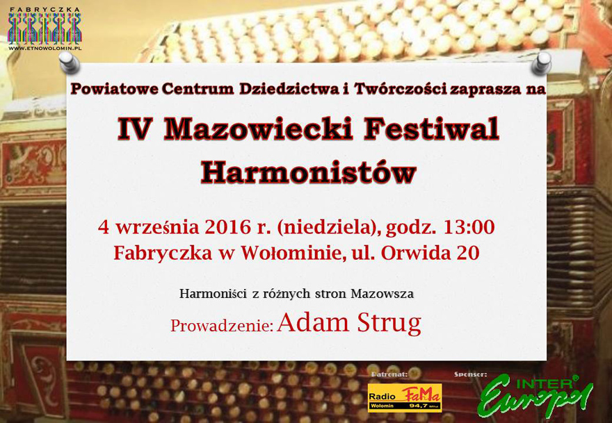 Dawniej obowiązkowym elementem na weselach, zabawach miejskich, wiejskich i potańcówkach była harmonia lub akordeon. Obecnie dość często pary młode wracają do tego zwyczaju opuszczając dom przy dźwiękach tego typu instrumentów, lub bawią się przy akompaniamencie kapel ludowych. Festiwal będzie świetną okazją do przypomnienia dźwięków harmonii.