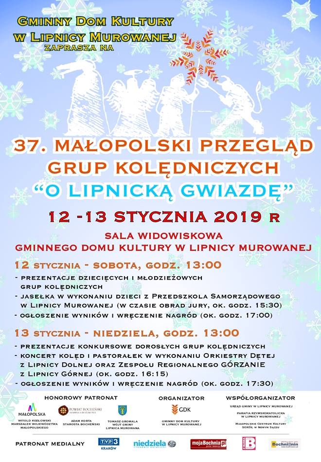 Gminny Dom Kultury w Lipnicy Murowanej serdecznie zaprasza na 37 Małopolski Przegląd Grup Kolędniczych „O Lipnicką Gwiazdę”. Wydarzenie odbędzie się w dniach 12-13 stycznia 2019 r. w sali widowiskowej GDK w Lipnicy Murowanej. |