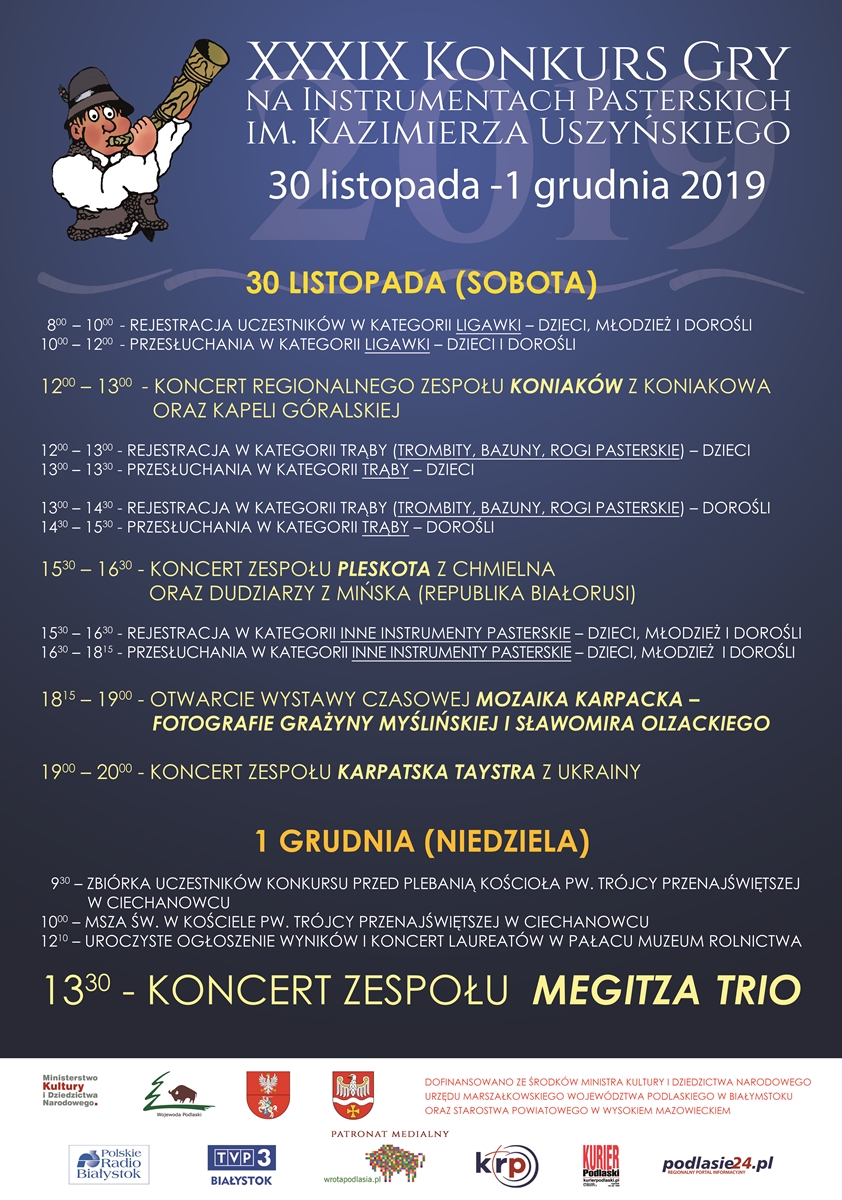 Trombity, ligawki, bazuny, rogi… już w sobotę, 30 listopada w Muzeum Rolnictwa w Ciechanowcu rozpocznie się kolejna edycja konkursu gry na instrumentach pasterskich. Wydarzeniu towarzyszyć będzie otwarcie wystawy fotografii Grażyny Myślińskiej i Sławomira Olzackiego „Mozaika karpacka”. |