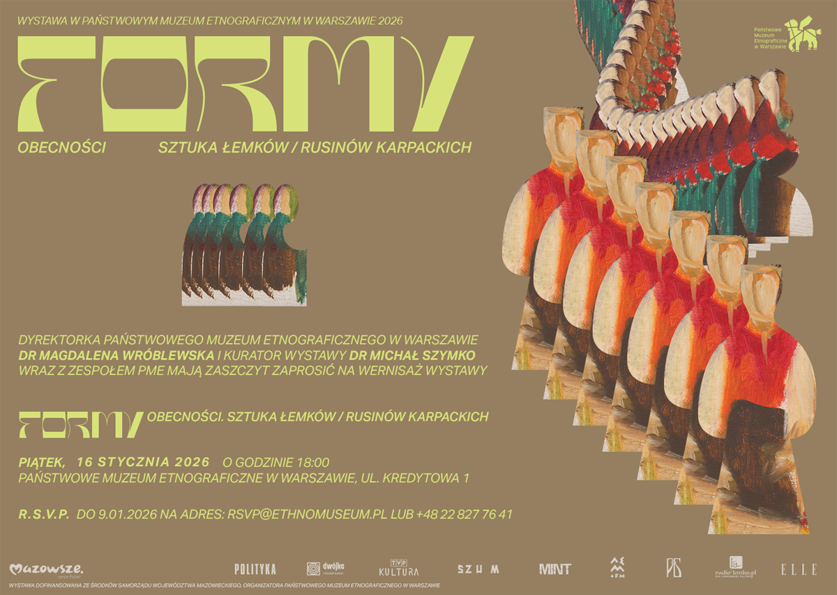 Dyrektorka Państwowego Muzeum Etnograficznego w Warszawie, dr Magdalena Wróblewska i kurator wystawy dr Michał Szymko wraz z zespołem PME mają zaszczyt zaprosić na wernisaż wystawy Formy obecności. Sztuka Łemków / Rusinów Karpackich. |