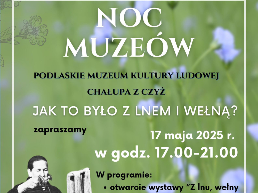 Przed nami Europejska Noc Muzeów. W Podlaskim Muzeum Kultury Ludowej to w tym roku przede wszystkim nowa wystawa czasowa poświęcona tkactwu. Otwarcie 17 maja o godzinie 17.00 w chałupie z Czyż. |