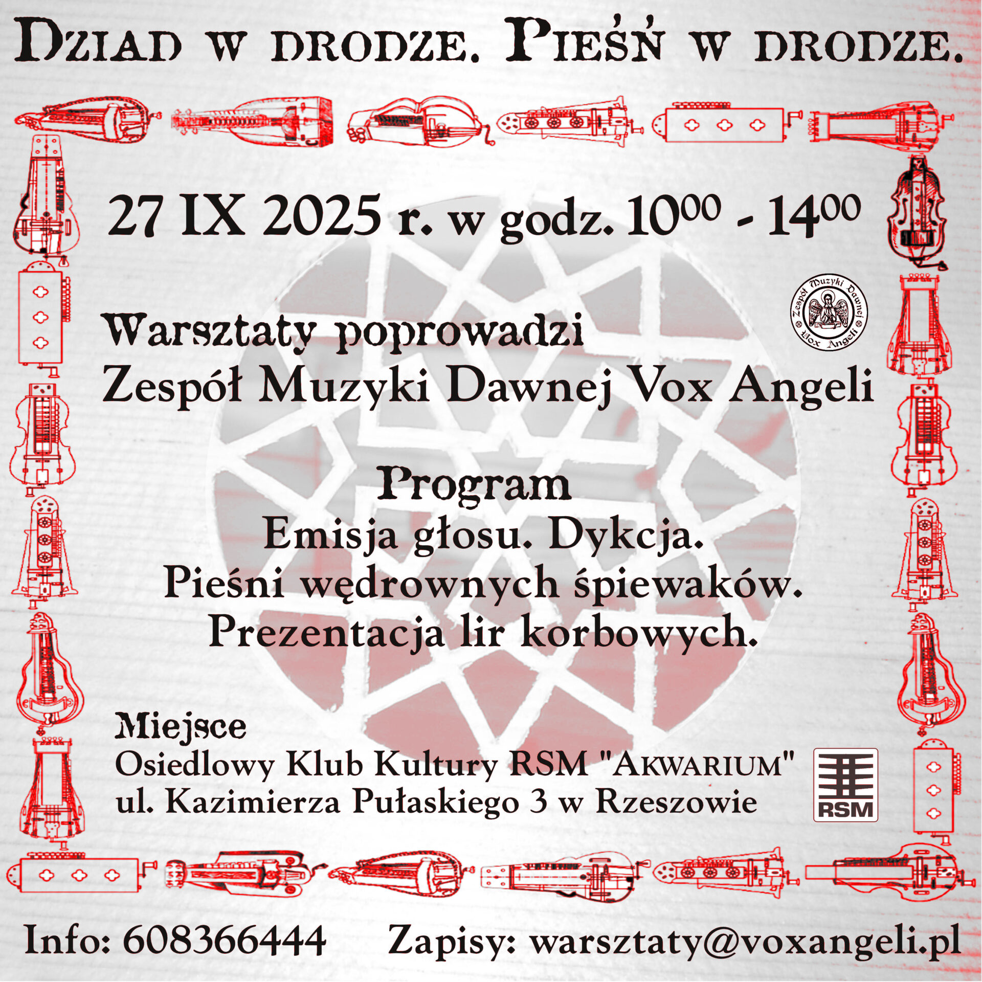 Zespół Muzyki Dawnej Vox Angeli zaprasza na warsztaty pieśni wędrownych śpiewaków pt. „Dziad w drodze. Pieśń w drodze”. Spotkanie odbędzie się w Osiedlowym Klubie Kultury RSM „Akwarium” w Rzeszowie, w sobotę 27 września 2025 r. w godz. 10:00 - 14:00. |