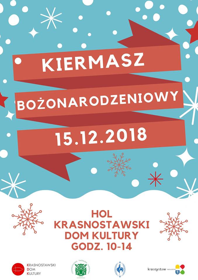 Krasnostawski Dom Kultury zaprasza na Kiermasz Bożonarodzeniowy, który odbędzie się w holu głównym Krasnostawskiego Domu Kultury w dniu 15 grudnia 2018 r. /sobota/ w godz. 10-14.
