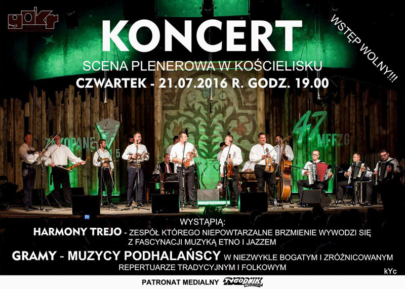 Gminny Ośrodek Kultury Regionalnej Kościelisko serdecznie zaprasza miłośników folkloru na koncert, który odbędzie się 21 lipca o godz. 19.00 na scenie plenerowej na Chotarzu w Kościelisku.