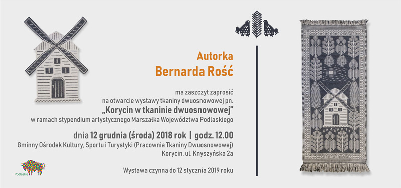 Wernisaż wystawy prac artystycznych tkaniny dwuosnowowej podsumowującej projekt stypendialny Bernardy Rość pt. „Korycin w tkaninie dwuosnowowej. Cykl warsztatów rękodzielniczych tkactwa dwuosnowowego dla dzieci i młodzieży szkolnej pt. Ocalić od zapomnienia”.