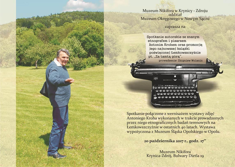 Muzeum Nikifora w Krynicy – Zdroju, oddział Muzeum Okręgowego w Nowym Sączu zaprasza na Spotkanie autorskie ze znanym etnografem i pisarzem Antonim Krohem oraz promocję jego najnowszej książki poświęconej Łemkowszczyźnie pt. „Za tamtą górą”.