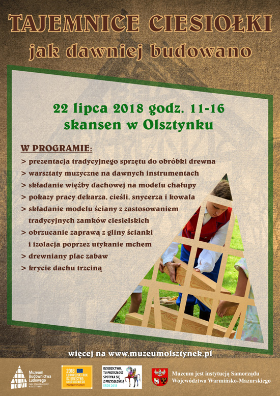 22 lipca w skansenie w Olsztynku odbędzie się kolejna edycja imprezy edukacyjnej „Tajemnice ciesiołki - jak dawniej budowano”. Pracownicy muzeum w Olsztynku opowiedzą o tradycyjnym budownictwie wiejskim na Warmii, Mazurach i Powiślu. Omówią historię i specyfikę budowy drewnianych chałup. Pokażą przykłady rozwiązań konstrukcyjnych i ich zastosowanie. Zwiedzający będzie mógł złożyć zrąb chałupy w Nie zabraknie atrakcji dla najmłodszych. Dzieci będą mogły pobawić się na drewnianym placu zabaw, poukładać architektoniczne puzzle, drewniane klocki. Dodatkowym urozmaiceniem podczas imprezy będą „Warsztaty muzyczne na dawnych instrumentach”. Wszystkie działania na terenie Parku Etnograficznego w Olsztynku odbędą się w godzinach 11:00-16:00. Wydarzenie zostało objęte patronatem Europejskiego Roku Dziedzictwa Kulturowego 2018.