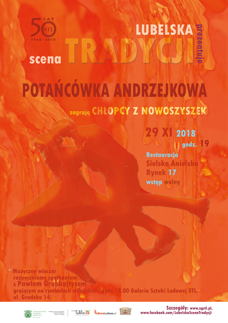 Stowarzyszenie Twórców Ludowych w ramach cyklu Lubelska Scena Tradycji zaprasza na Potańcówkę Andrzejkową, na której do tańca zagrają muzykanci z Suwalszczyzny - Chłopcy z Nowoszyszek. Muzyczny wieczór rozpoczniemy spotkaniem z Pawłem Grupkajtysem grającym na cymbałach wileńskich.