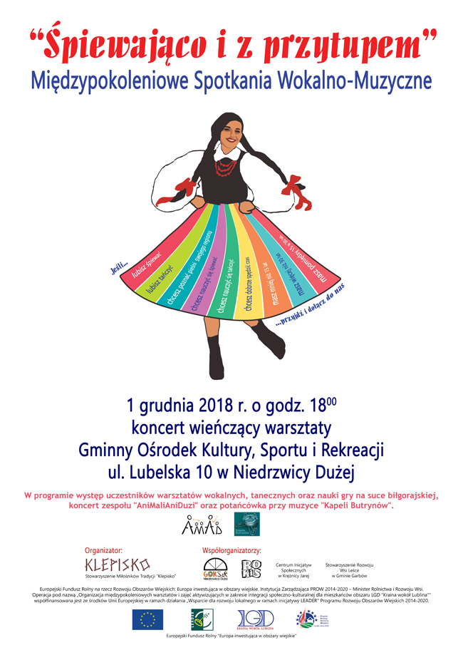 Stowarzyszenie Klepisko zaprasza na podsumowanie warsztatów muzyki ludowej "Śpiewająco i z przytupem"oraz potańcówkę. |