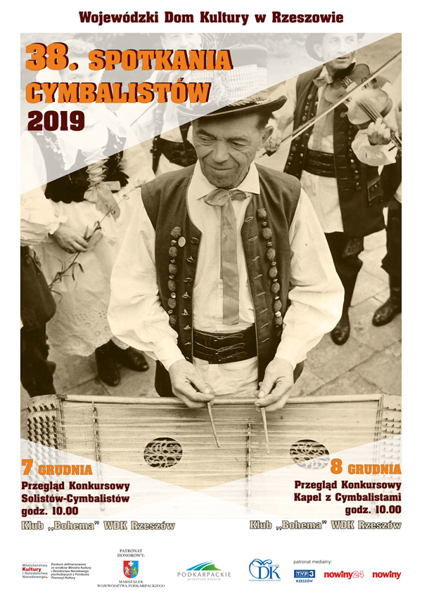W dniach 7-8 grudnia 2019 r. Wojewódzki Dom Kultury w Rzeszowie organizuje 38. Spotkania Cymbalistów. Konkurs ma niepowtarzalny w skali kraju charakter. Ocala od zapomnienia sztukę gry na cymbałach - tradycyjnym, charakterystycznym dla Podkarpacia instrumencie.