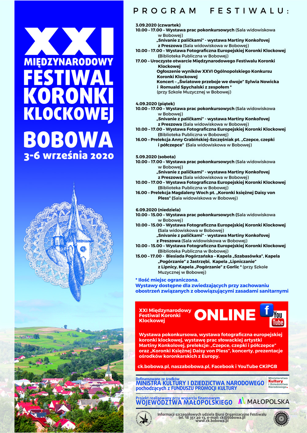 W czwartek, 3 września 2020 roku koncertem „Światowe przeboje we dwoje” – w wykonaniu Sylwii Nowickiej i Romualda Spychalskiego z zespołem rozpocznie się XXI Międzynarodowy Festiwal Koronki Klockowej w nowej, hybrydowej formule na czas pandemii. |