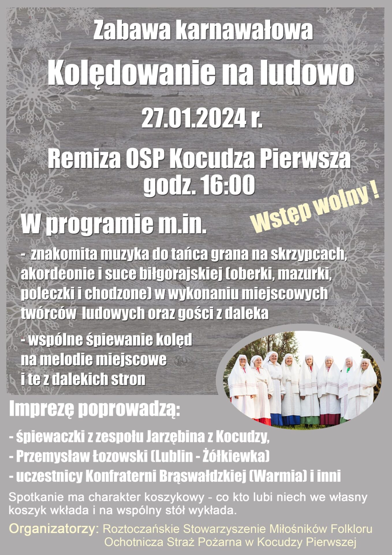 27 stycznia w Kocudzy (woj. lubelskie) odbędzie kolędowanie oraz zabawa karnawałowa. Imprezę poprowadzą śpiewaczki z zespołu Jarzębina z Kocudzy, Przemysław Łozowski (Lublin-Żółkiewka) i uczestnicy Konfraterni Brąswałdzkiej (Warmia). |