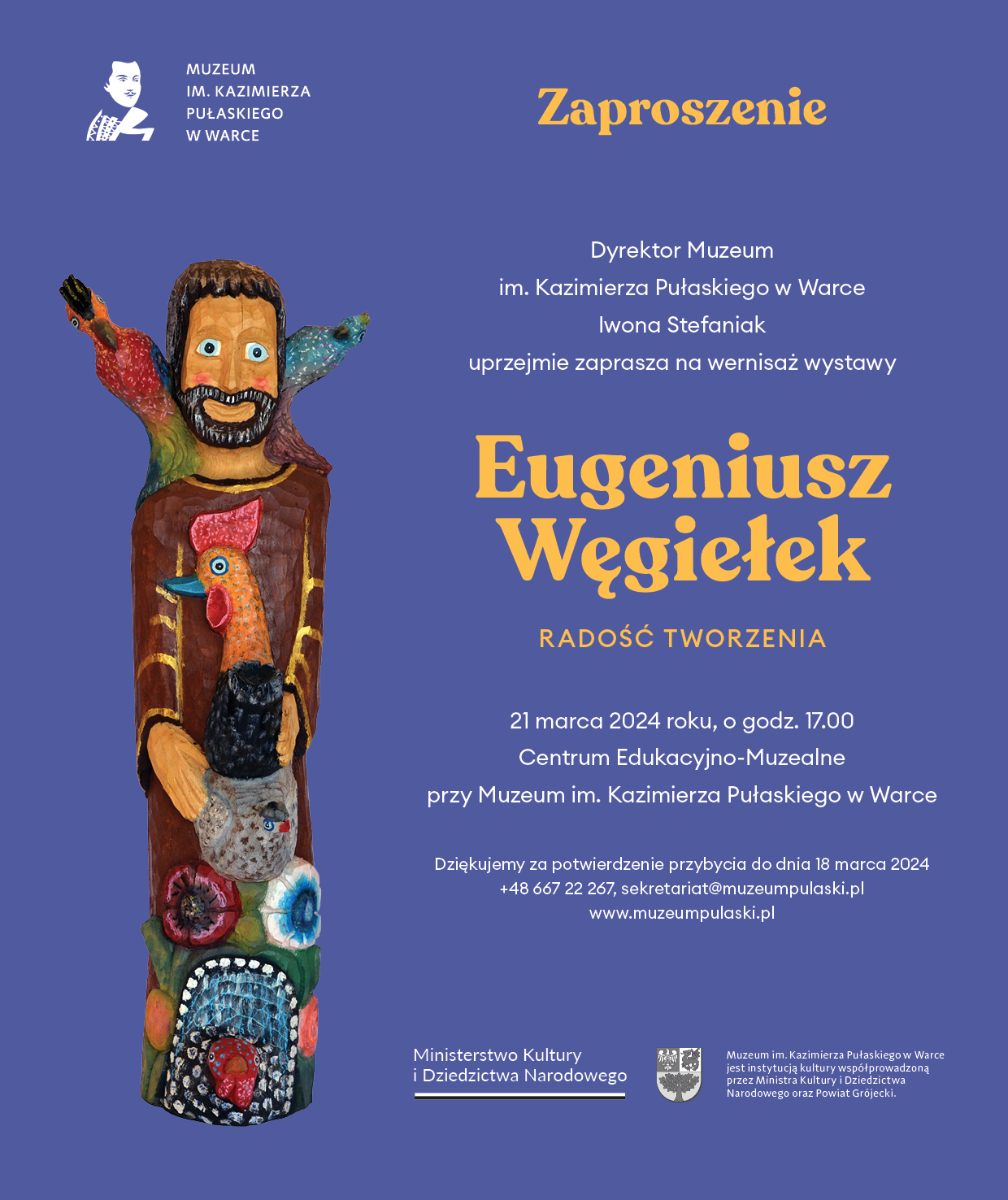Dyrektor Muzeum im. Kazimierza Pułaskiego w Warce Iwona Stefaniak wraz z Zespołem zaprasza na wystawę „Eugeniusz Węgiełek. Radość tworzenia”. Wernisaż odbędzie się 21 marca 2024 roku (wstęp tylko z zaproszeniami) w Centrum Edukacyjno-Muzealnym przy Muzeum im. Kazimierza Pułaskiego w Warce. |