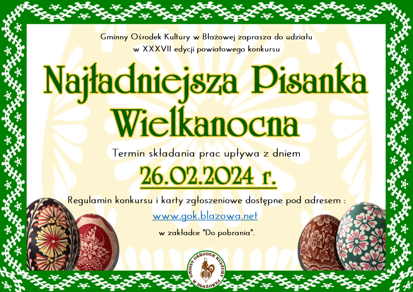 Gminny Ośrodek Kultury w Błażowej zaprasza do wzięcia udziału w XXXVII edycji powiatowego konkursu „Najładniejsza Pisanka Wielkanocna”. |