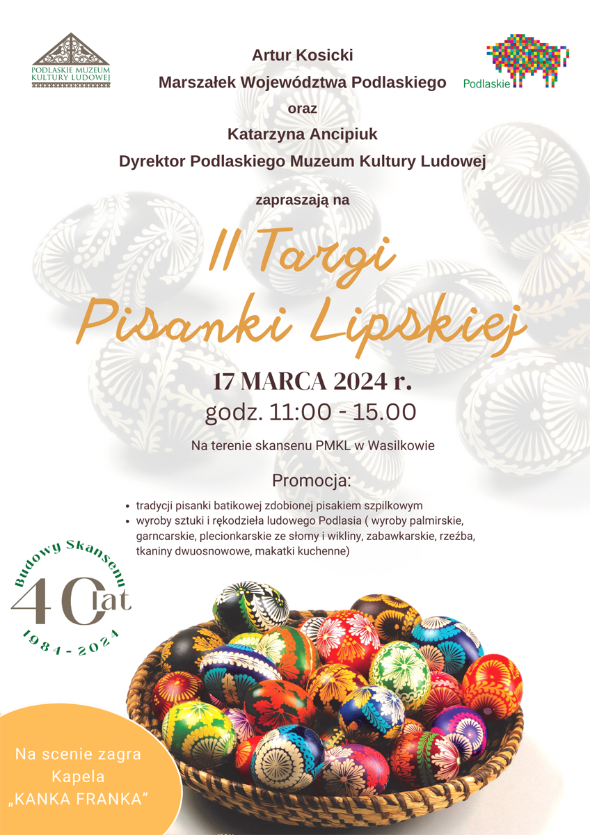 II Targi Pisanki Lipskiej w Podlaskim Muzeum Kultury Ludowej! Będzie kolorowo, ludowo i świątecznie. Do pisankarek z Lipska nad Biebrzą, podobnie jak w ubiegłym roku, dołączą inni twórcy. Przywiozą to, co potrzebne na Wielkanoc: wiklinowe koszyki na święconkę, szydełkowe serwetki, a także palmy, drewniane zabawki, makatki i rzeźby. Zapraszamy do zagrody z Pieczysk w niedzielę 17 marca od godz. 11.00 do 15.00.