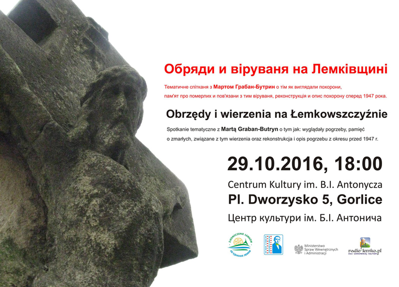 Centrum Kultury im B I Antonycza w Gorlicach zaprasza 29 października 2016 na spotkanie poświęcone obrzędom i wierzeniom na Łemkowszczyźnie.