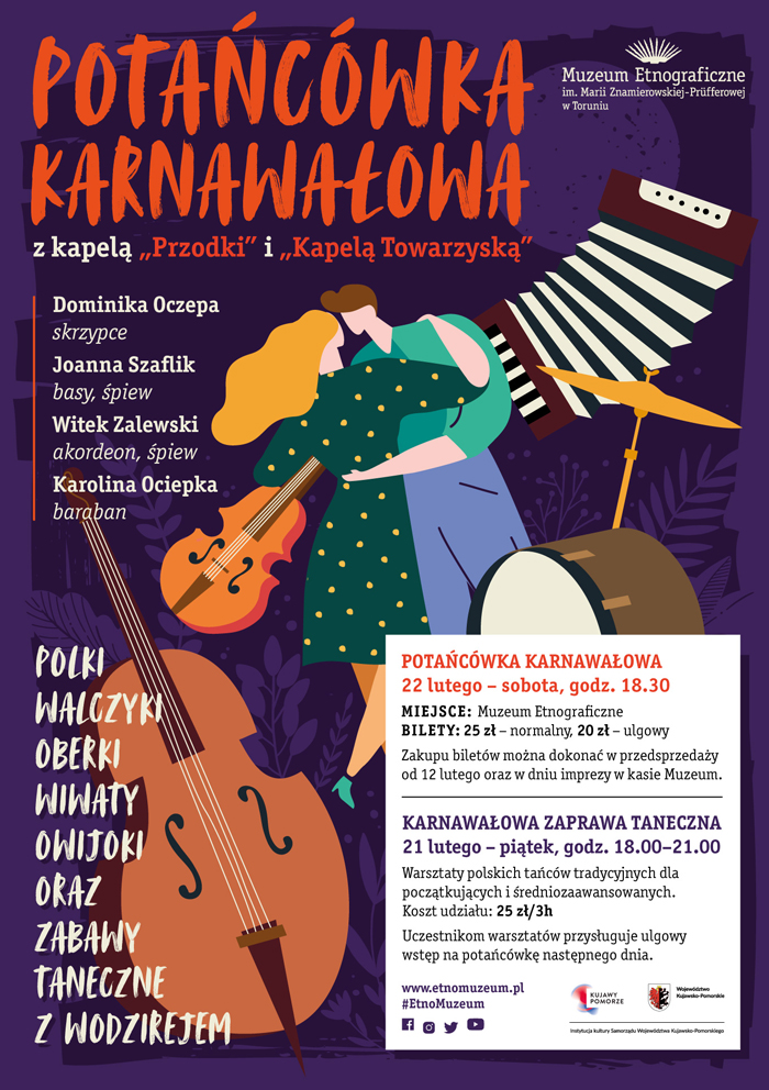 W sobotę 22 lutego o godz. 18.30 w Muzeum Etnograficznym w Toruniu odbędzie się Potańcówka karnawałowa z kapelą „Przodki” i „Kapelą Towarzyską”.
