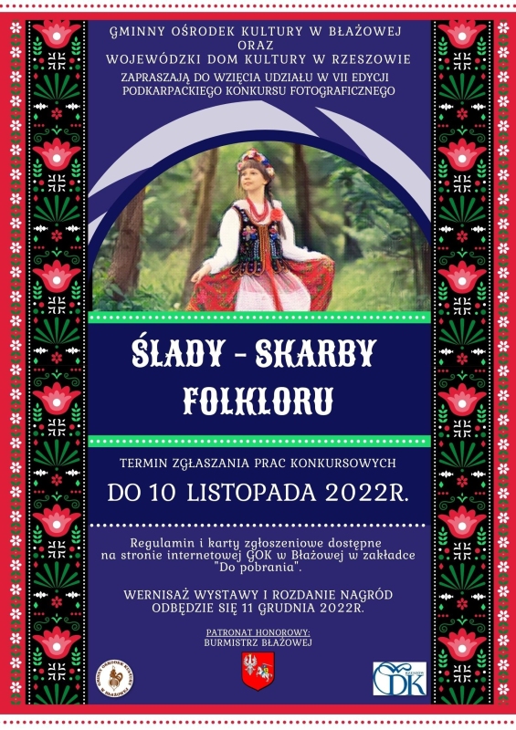 Gminny Ośrodek Kultury w Błażowej wspólnie z Wojewódzkim Domem Kultury w Rzeszowie po raz siódmy organizują Podkarpacki Konkurs Fotograficzny “ŚLADY – Skarby Folkloru”, który jest objęty Honorowym Patronatem Burmistrza Błażowej.