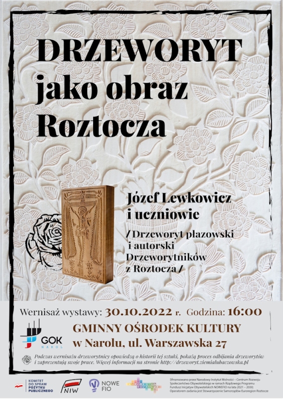 W niedzielę 30 października 2022 o godz. 16:00 w Gminnym Ośrodku Kultury w Narolu odbędzie się wernisaż wystawy drzeworytów autorstwa Józefa Lewkowicza i jego uczniów: Jagody Kostrzyckiej, Błażeja Kostrzyckiego, Antoniny Kołodziej, Ignacego Kołodziej, Aleksandra Kołodziej, Tymka Bochen, Natalii Bochen, Arkadiusza Bochen, Rozalii Cencory, Anny Krzemińskiej, Katarzyny Petrykowskiej, Renaty Polczak, Kamila Polczak, Anny Serkis-Wojtowicz, Grzegorza Ciećki.