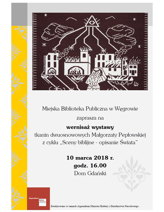 Miejska Biblioteka Publiczna w Węgrowie zaprasza na wernisaż wystawy tkanin dwuosnowowych Małgorzaty Pepłowskiej z cyklu „Sceny biblijne – opisanie Świata”.