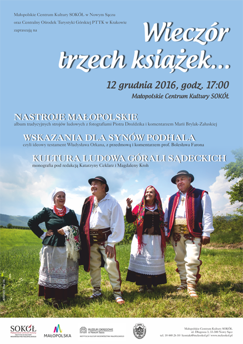 Małopolskie Centrum Kultury SOKÓŁ w Nowym Sączu serdecznie zaprasza na spotkanie promujące trzy książki, które niedawno się ukazały: NASTROJE MAŁOPOLSKIE Piotra Droździka, Marii Brylak-Załuskiej, WSKAZANIA DLA SYNÓW PODHALA Władysława Orkana (wydawca – Małopolskie Centrum Kultury SOKÓŁ) oraz KULTURA LUDOWA GÓRALI SĄDECKICH pod redakcją Katarzyny Ceklarz i Magdaleny Kroh (Biblioteka Górska COTG PTTK).