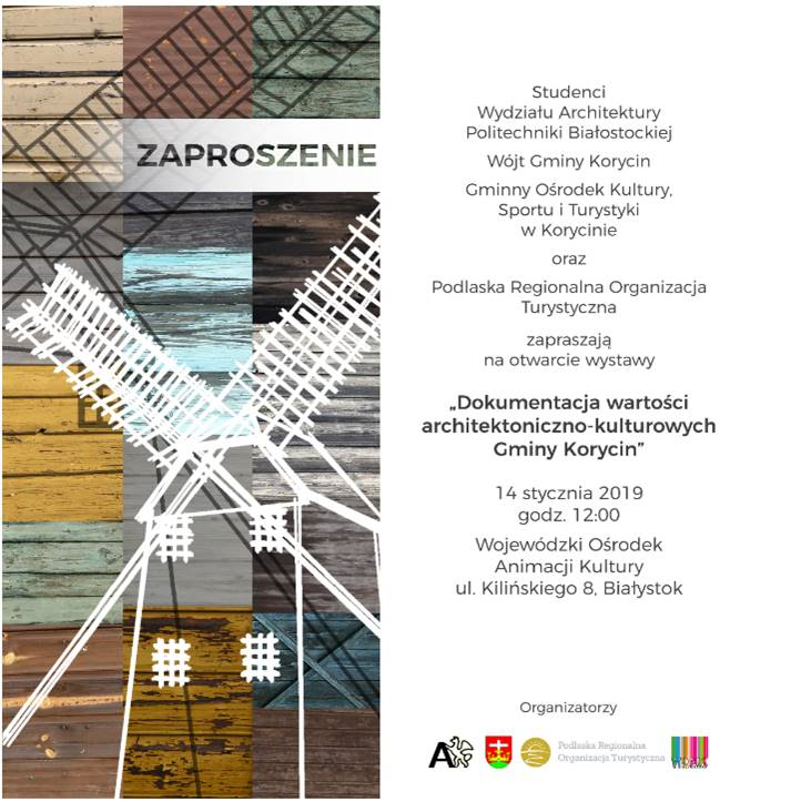 14 stycznia o godz. 12.00 w Wojewódzkim Ośrodku Animacji Kultury w Białymstoku odbędzie się wernisaż wystawy „Odkrywamy Korycin – dokumentacja wartości architektoniczno-kulturowych Gminy Korycin”. Wystawa jest rezultatem trwających kilka miesięcy badań architektoniczno-etnograficznych prowadzonych przez ze Studentów III roku Wydziału Architektury Politechniki Białostockiej.