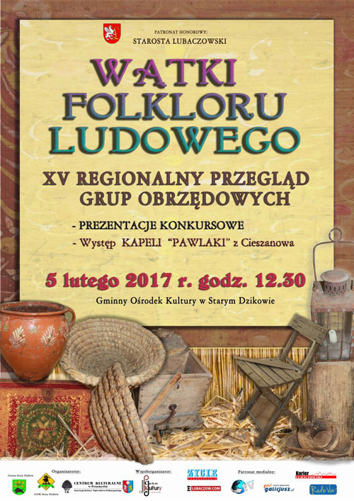 5 lutego o godz. 12:30 w Gminnym Ośrodku Kultury w Starym Dzikowie rozpocznie się XV Regionalny Przegląd Grup Obrzędowych „Wątki Folkloru Ludowego”. Wstęp wolny.