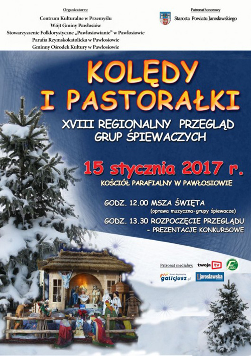 Centrum Kulturalne w Przemyślu zaprasza na XVIII Regionalny Przegląd Grup Śpiewaczych „Kolędy i Pastorałki”, który odbędzie się 15 stycznia 2017 r. w kościele pw. Św. Apostołów Piotra i Pawła w Pawłosiowie.