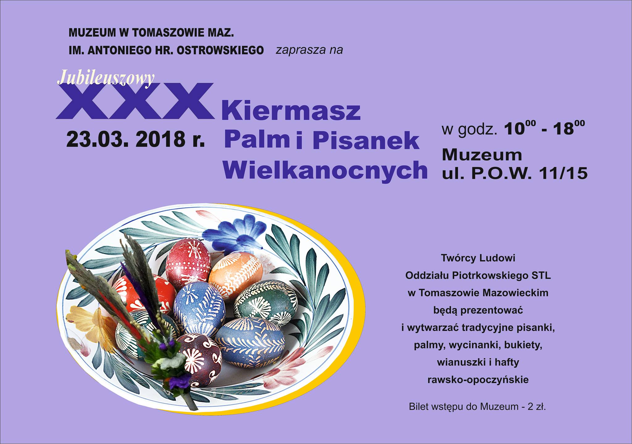 Muzeum w Tomaszowie Mazowieckim im. Antoniego hr. Ostrowskiego oraz Stowarzyszenie Twórców Ludowych Oddział Piotrkowski zapraszają na Jubileuszowy XXX Kiermasz Palm i Pisanek Wielkanocnych, który odbędzie się 23 marca 2018 r. (piątek) wyjątkowo w godz. 10:00 – 18:00 w salach Muzeum w Tomaszowie Maz. im. A. hr. Ostrowskiego.