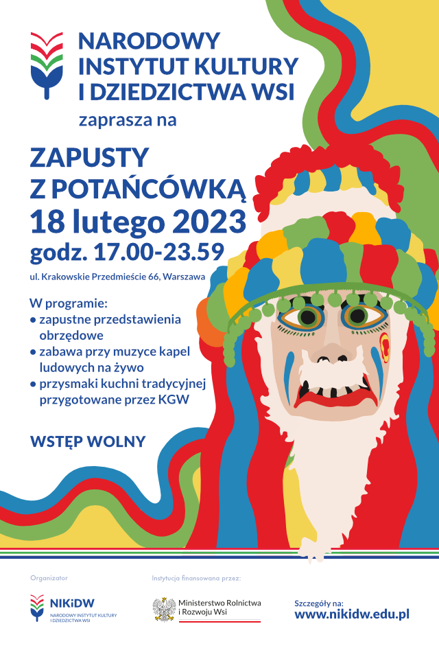 Zapusty z Narodowym Instytutem Kultury i Dziedzictwa Wsi rozpoczną dwa spektakle obrzędowe. Jako pierwszy wystąpi zespół Stowarzyszenia Zagrody Razem, który przeniesie widzów w świat dawnej wsi lubelskiej. Będzie można usiąść przy suto zastawionym stole zapustnym i wspólnie świętować ostatnie dni karnawału. Warto dodać, że przedstawienie w ubiegłym roku zdobyło pierwsze miejsce w II edycji Konkursu o Nagrodę Małżonki Prezydenta RP. Po krótkiej przerwie na scenę wejdą artyści z Teatru Ludowego i Zespołu Ludowego Łucy-Babki, który działa przy Gminnym Ośrodku Kultury w Ujeździe, aby odegrać przedstawienie pt. „Ujedzkie zapusty”.